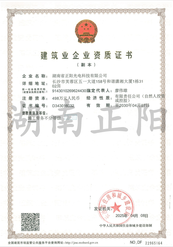 2025年4月8日,經(jīng)長沙市住房和城鄉(xiāng)建設局審核批準,湖南省正陽光電科技有限公司成功獲得“施工勞務”資...
